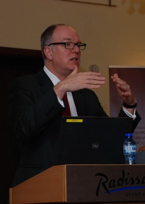 | НП Джеймс Уорлик, открива форума; нашият Съвет на експертите е на заден план (снимка: E. Волева) | Карл Форцхаймър приветства участниците и гостите на форума; Динчо Кръстев е до него (снимка: E. Волева) |